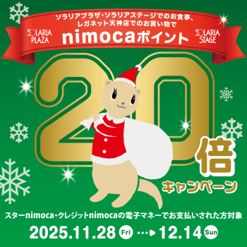 期間中に、ソラリアプラザ・ソラリアステージの飲食店・食物販店およびスーパーマーケットレガネット天神店にてnimoca電子マネーでお支払いいただいた方を対象に、通常の20倍のnimocaポイントを進呈いたします。