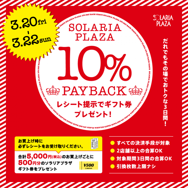 3月20日(金・祝)~22日(日)の3日間、10%ペイバックを開催します!